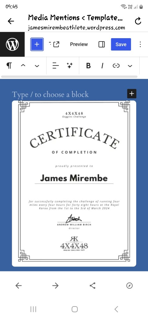 Official certificate of completion for the 4×4×48 Goggins Challenge (48 miles over 48 hours).